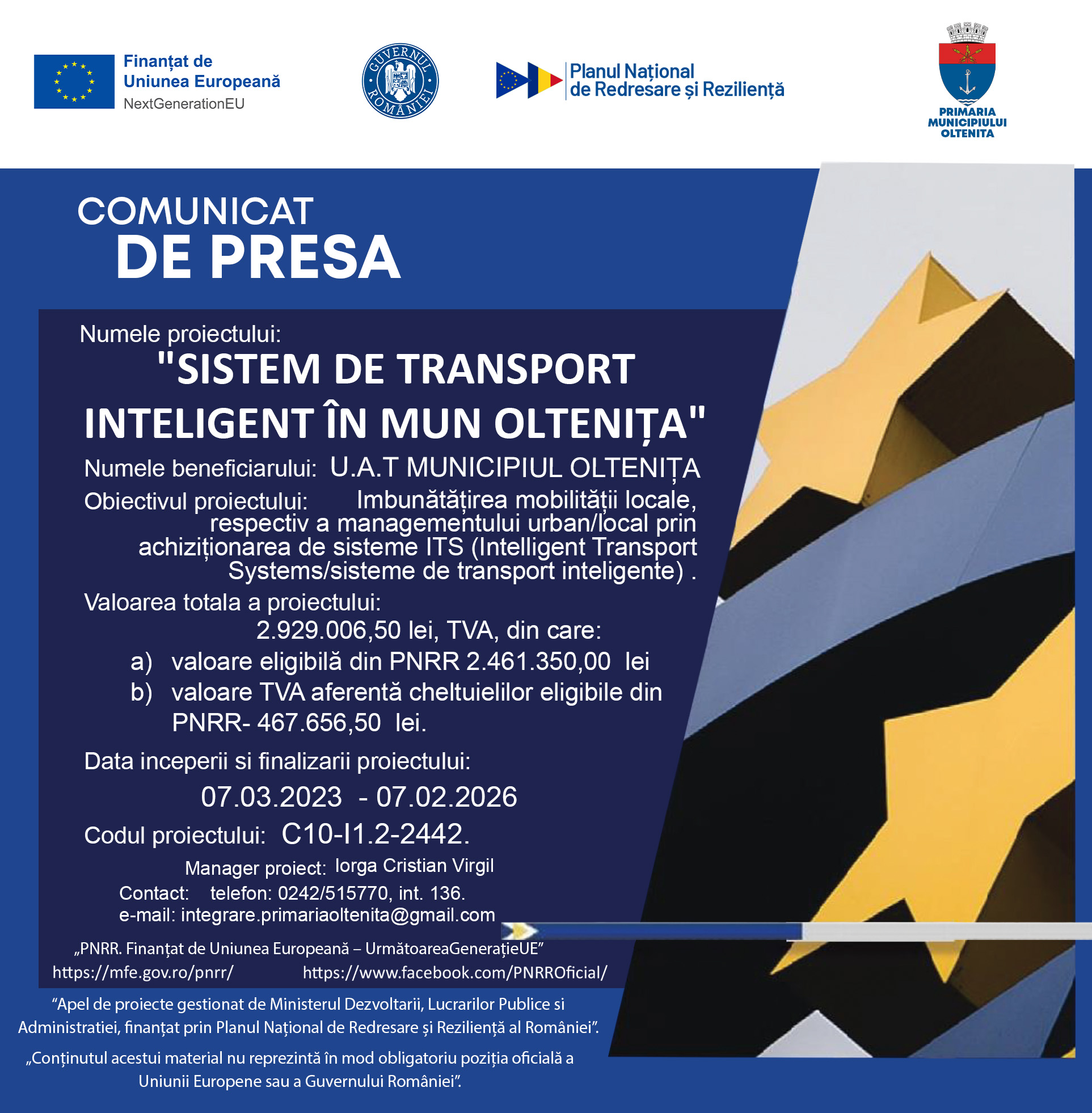 Reclame Comunicat de presă referitor la proiectul “SISTEM DE TRANSPORT INTELIGENT IN MUN OLTENITA” Published 3 years ago on 06/08/2023 By inCalarasi.ro Share Tweet Related Topics: Up Next Senatorul Ciprian Pandea și echipa PNL anunță determinarea de a transforma Călărași cu un proiect revitalizant Don't Miss Alina Gorghiu și George Șerban, vizită de lucru în Călărași alături de senatorul Ciprian Pandea: Dialog și dezbateri politice Continue Reading You may like Click to comment Leave a Reply Cancel replyYour email address will not be published. Required fields are marked *Comment * Name Email Website Advertisement Latest Trending Videos Reclame2 years ago Comunicat de presă ! Entertainment2 years ago Comunicat de presa ! Stiri2 years ago Comunicat de presă Stiri4 years ago KFC-Drive Thru in Călărași Educatie4 years ago Borcea | Petrecere pentru copii, organizată de primarul Nedelcu Pațurcă Theodor Aniel Uncategorized4 years ago Doi noi subprefecți pentru județul Călărași Local3 years ago Mulțumesc colegilor din primărie, pentru promptitudinea de care dau dovada- Ilie Mihai -Primar oras Budesti Local4 years ago VIDEO – Acțiuni pentru siguranța rutieră \ 18 permise de conducere reținute ,134 de sancțiuni contravenționale si un cerificat de înmatriculare retras \ inCalarasi.ro Local4 years ago Liviu Petrache a fost ales președinte al TNL Călărași Cele mai vizualizate