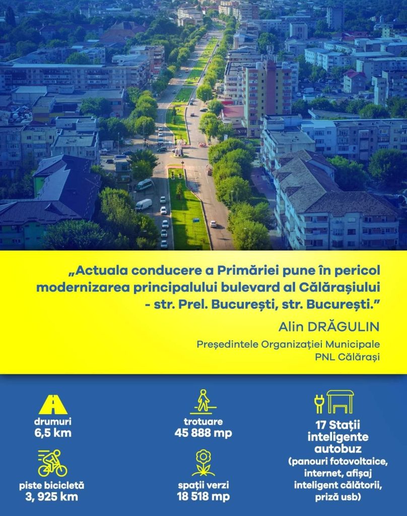 💰După obținerea finanțării europene, de către administrația liberală și întocmirea caietului de sarcini, în cursul anului 2020 demara licitația publică a proiectării și modernizării principalei artere de trafic din municipiul Călărași. Acesta a fost semnat în decembrie 2019 fiind primul proiect finanțat la nivel regional, pe Axa mobilității urbane.