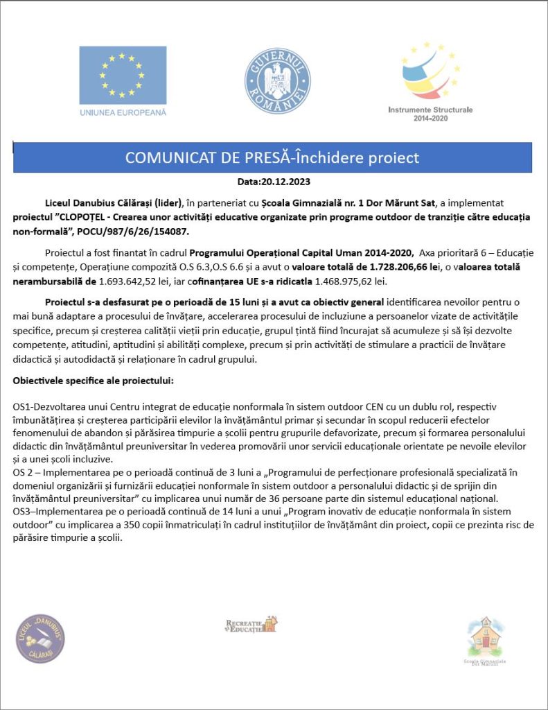 Stiri Comunicat de presa ”CLOPOȚEL – Crearea unor activități educative organizate prin programe outdoor de tranziție către educația non-formală” Published 2 years ago on 20/12/2023 By inCalarasi.ro Share Tweet Related Topics: Up Next Programul „Primul Student din Familie”: O Inițiativă PNL pentru Reducerea Abandonului Universitar Don't Miss Comunicat de presa ”ACTIV – Activități educaționale non-formale pentru dezvoltarea elevilor” Continue Reading You may like Click to comment Leave a Reply Cancel replyYour email address will not be published. Required fields are marked *Comment * Name Email Website Advertisement Latest Trending Videos Reclame2 years ago Comunicat de presă ! Entertainment2 years ago Comunicat de presa ! Stiri2 years ago Comunicat de presă Stiri4 years ago KFC-Drive Thru in Călărași Educatie4 years ago Borcea | Petrecere pentru copii, organizată de primarul Nedelcu Pațurcă Theodor Aniel Uncategorized4 years ago Doi noi subprefecți pentru județul Călărași Local3 years ago Mulțumesc colegilor din primărie, pentru promptitudinea de care dau dovada- Ilie Mihai -Primar oras Budesti Local4 years ago VIDEO – Acțiuni pentru siguranța rutieră \ 18 permise de conducere reținute ,134 de sancțiuni contravenționale si un cerificat de înmatriculare retras \ inCalarasi.ro Local4 years ago Liviu Petrache a fost ales președinte al TNL Călărași Cele mai vizualizate