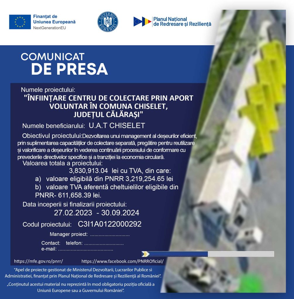 Local Comunicat de presă referitor la proiectul ,,ÎNFIINȚARE CENTRU DE COLECTARE PRIN APORT VOLUNTAR ÎN COMUNA CHISELET, JUDEȚUL CĂLĂRAȘI” Published 2 years ago on 05/02/2024 By inCalarasi.ro Share Tweet Related Topics: Up Next Propunere legislativă: Transformarea facilă a PFA-urilor în persoane juridice pentru evitarea pierderii istoricului fiscal Don't Miss Copiii ne mor de droguri, USR și Ciolos vor să legalizeze canabisul (stiripesurse.ro) Continue Reading You may like Click to comment Leave a Reply Cancel replyYour email address will not be published. Required fields are marked *Comment * Name Email Website Advertisement Latest Trending Videos Reclame2 years ago Comunicat de presă ! Entertainment2 years ago Comunicat de presa ! Stiri2 years ago Comunicat de presă Stiri4 years ago KFC-Drive Thru in Călărași Educatie4 years ago Borcea | Petrecere pentru copii, organizată de primarul Nedelcu Pațurcă Theodor Aniel Uncategorized4 years ago Doi noi subprefecți pentru județul Călărași Local3 years ago Mulțumesc colegilor din primărie, pentru promptitudinea de care dau dovada- Ilie Mihai -Primar oras Budesti Local4 years ago VIDEO – Acțiuni pentru siguranța rutieră \ 18 permise de conducere reținute ,134 de sancțiuni contravenționale si un cerificat de înmatriculare retras \ inCalarasi.ro Local4 years ago Liviu Petrache a fost ales președinte al TNL Călărași Cele mai vizualizate